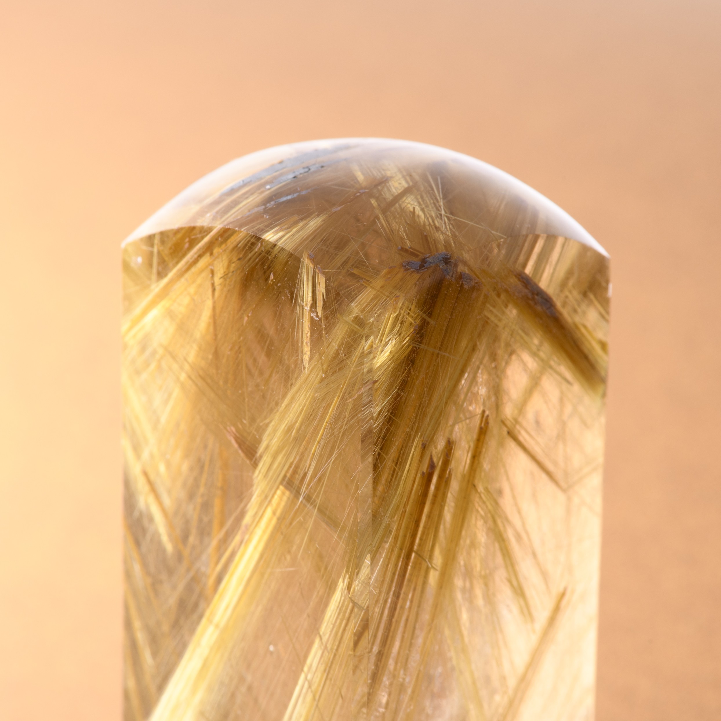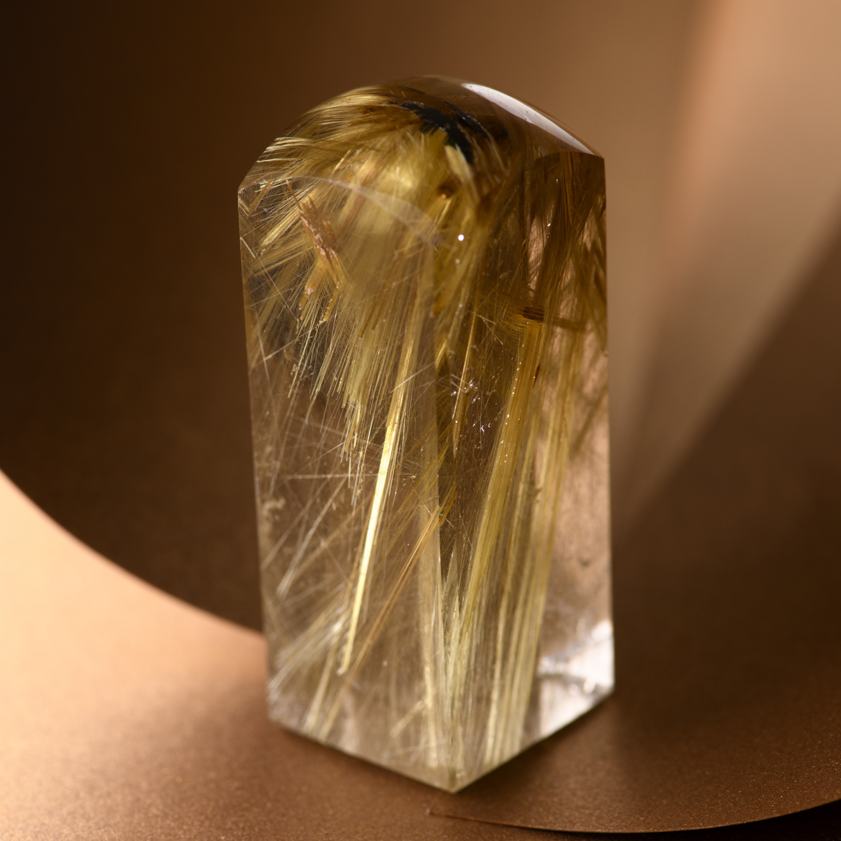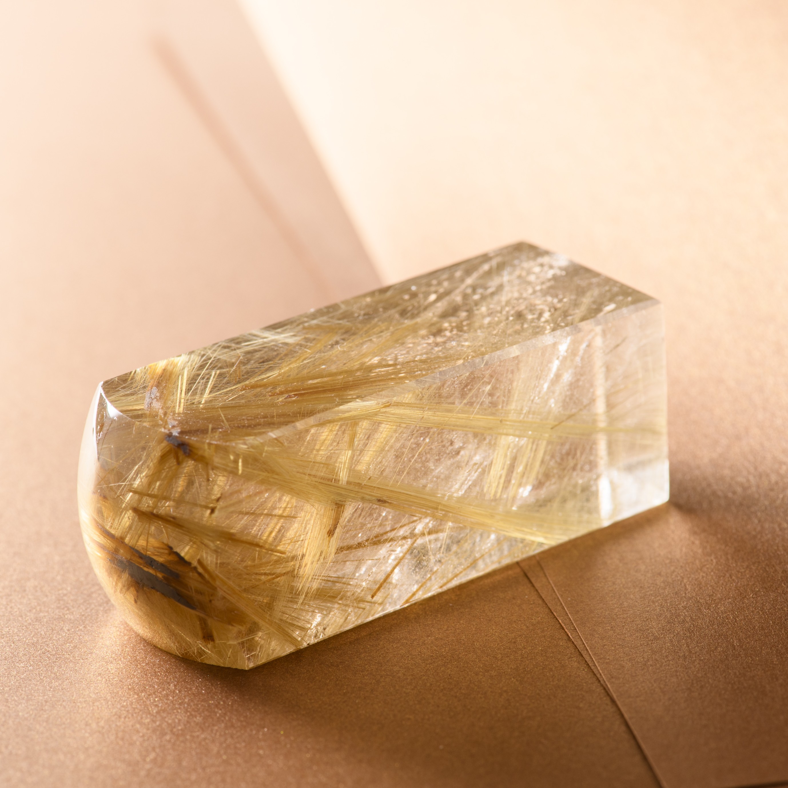 限りなく透明に近い水晶の中を、光の束のように貫く黄金色の針。 その一本一本が力強い意志を宿し、見る角度によって眩いほどの輝きを放つ、極上のルチルクォーツ角印です。