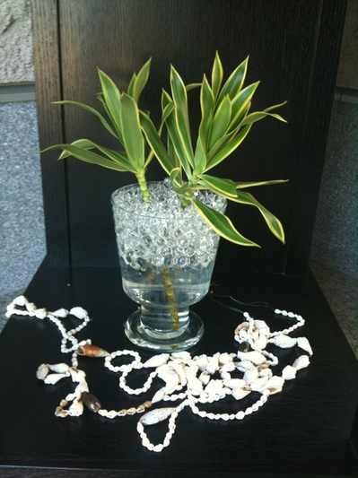 ローズストーンのエントランスです。 ただ今こんな涼しげなアレンジを飾っております。 バンブーの根本をよく見てみると・・・