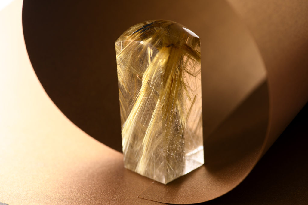 透明な水晶の中に、金色の針状結晶「ルチル」が伸びる不思議な天然石。