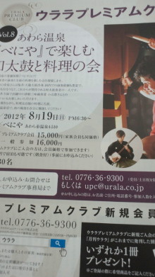 この度ウララプレミアムに入会しました。 来月8月19日 日曜日には あわら温泉 ベにやさんにて 「べにやで楽しむ和太鼓と料理の会」 が行われます。 和太鼓のスカッとするような演奏を楽しみながら 美味し […]