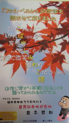 ファム・ベルシェ12月号に掲載された記事をご覧下さった 益茂証券の益永会長様より、 ひらがな和歌を2通も頂戴致しました。 o(〃^▽^〃)o これがファム・ベルシェの記事です。 いつも温かいお葉書 […]